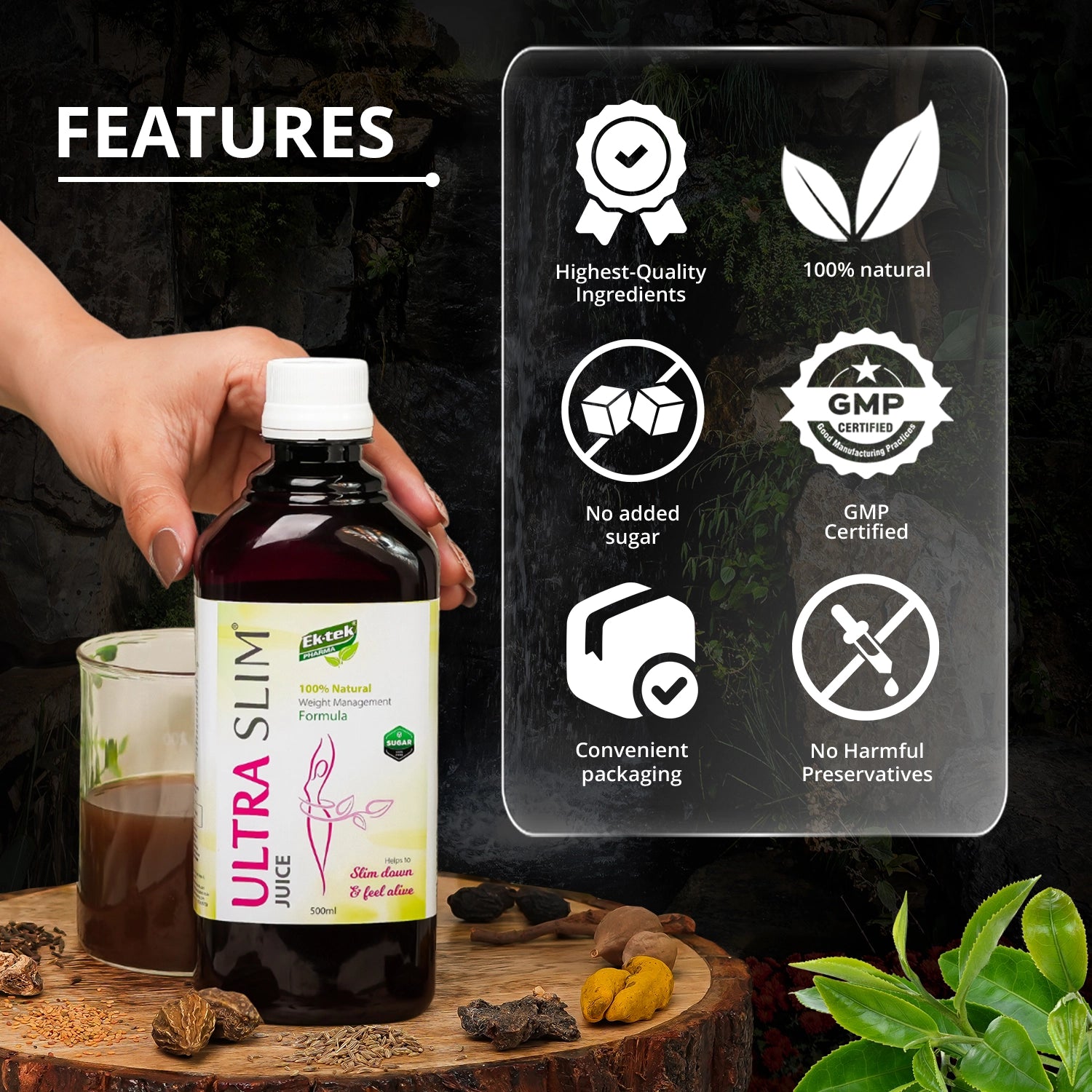 Ektek’s Ultra Slim, a premium Ayurvedic belly fat burner, enhances overall well-being by supporting balanced energy levels and nourishing your body with Ayurvedic herbs known for their holistic health benefits.